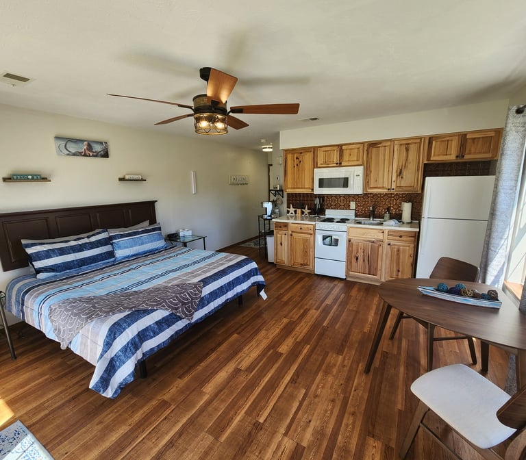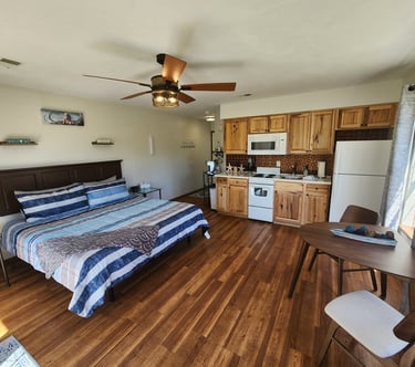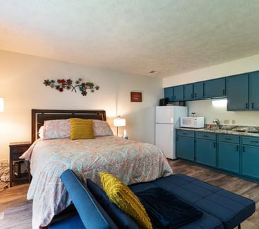This studio at Fall Creek is a 384 Sq Ft. ground floor unit. It has 1 bathroom and one great room with a queen bed, sleeper chair and a kitchenette. It can sleep and dine 3 people with a smart TV for those relaxing evenings. Sit out on the patio and enjoy the scenery. We do have other units in the area that sleeps 6 and 2 if you need more room.